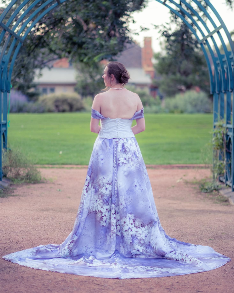 It…did not go so well at first. My initial ideas proved too difficult for me to drape, and I went back-and-forth on many design choices. The fabric shop ran out of the purple floral silk I was using and only sent 12 yards instead of 18, forcing me to rethink my entire design. I even redesigned and reconstructed the bodice entirely after it was finished, as I was so unsatisfied with the first one!